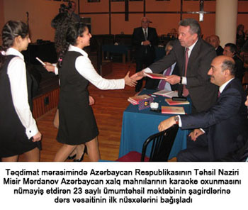 “Караоке. Азярбайжан халг мащнылары вя классик романслары” дярс вясаитинин мязиййятляри вя ящямиййяти Азярбайжан Республикасынын Тящсил Назири Мисир Мярдановун, Мядяниййят вя Туризм Назири Ябцлфяс Гарайевин, республиканын али мяктяб ректорларынын, Милли мяжлисин депутатларынын вя зийалыларын иштиракы иля кечирилян тягдимат мярасиминдя лайигинжя гиймятляндирилди.