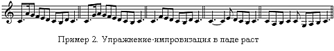 Упражнение-импровизация в ладе раст (пример 2). У. Гаджибеков пишет: «Четвертая ступень звукоряда (до – И. А.) – основной тон – несет функцию тоники. Тоника допускает скачки в восходящем направлении на терцию, верхнюю кварту, на квинту и на верхний вводный тон квинты; в нисходящем – на медианту тоники и на нижнюю кварту тоники» 9.