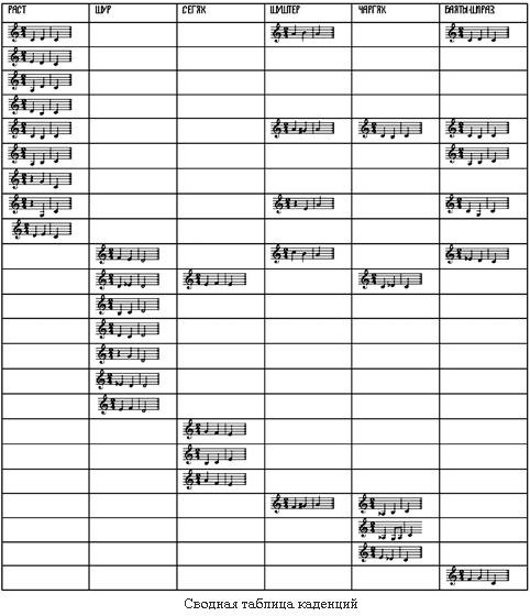 Индикаторами ладов служат их каденции. Примеры полных и половинных каденций ладов раст, шур, сегях, шуштер, чаргях, баяты-шираз даны У. Гаджибековым в «Основах азербайджанской народной музыки» Мы свели полные каденции этих ладов [5, 39-40, 50, 63, 69, 72, 80] 6 в общую таблицу, которая предложена ниже.