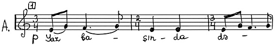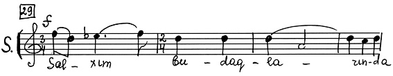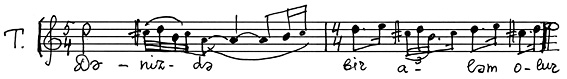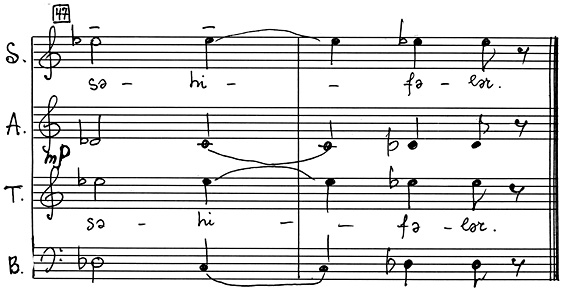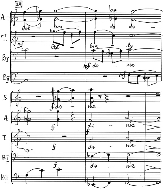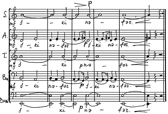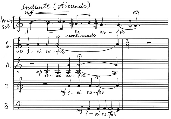 В некоторых случаях последний, словно подтверждая «высказывания» солиста, вторит ему. Иногда, напротив, хор излагает новую мысль, солист на нее откликается, в его исполнении она получает свое дальнейшее развитие. Примечателен тот факт, что партия солирующего Тенора изложена импровизационно, тогда как звучание хоровой массы укладывается в рамки одного такта (со свободным продлением звучания тонов в разных голосах). См. пример №5.