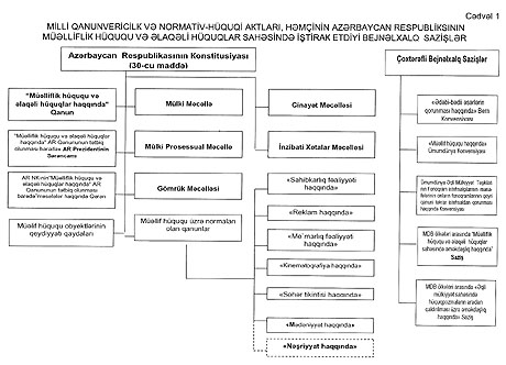 Bu materiala əlavə etdiyimiz 1-ci cədvəldə müəlliflik hüququ və əlaqəli hüquqlar sahəsində milli qanunvericiliyin və normativ-hüquqi aktların ümumi mənzərəsi, həmçinin Azərbaycan Respublikasının iştirakçısı olduğu beynəlxalq sazişlərin siyahısı əks etdirilmişdir. Buradaca qeyd etmək yerinə düşər ki, Qanunun 2-ci maddəsinə əsasən, Azərbaycan Respublikasının iştirakçısı olduğu beynəlxalq müqavilələrdə müəyyən edilmiş qaydalar bu Qanunla müəyyən edilmiş qaydalardan fərqli olduqda beynəlxalq müqavilənin qaydaları tətbiq edilir.