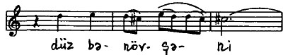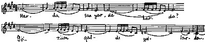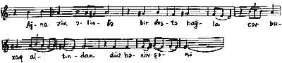 Göründüyü kimi, şerin birinci misrası aşağıya doğru pilləvari hərəkət edən kvarta həcmli melodik cümlədə səslənir. Daha sonra həmin melodik cümlə aşağı hərəkətli sekvensiya şəklini alır: