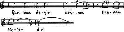 Lakin heç də bütün melodik cümlələrdə sual intonasiyaları yuxarı istiqamətli hərəkətlə müşayət olunmur. Artıq ikinci melodik cümlədə ilk ibarə kulminasiya nöqtəsindən başlayır və bununla da şerdəki misranın məzmunu daha qabarıq səslənir. Şair sevdiyi qızdan onlara qonaq gəlməyə icazə istədikdə, rədd cavabı alır. Qızın cavabı isə eyni melodik ibarənin variant şəklində səslənməsi ilə verilir: