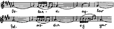 Sonrakı iki cümlə isə tədicən aşağıya doğru hərəkət edir və mahnının bəstələndiyi Bayatı-Şiraz ladının mayə pərdəsində dayanmaqla tamamlanır: