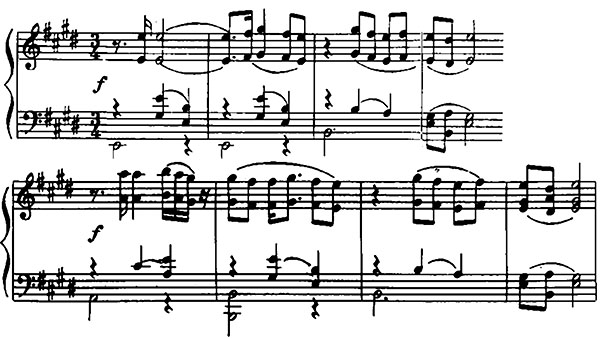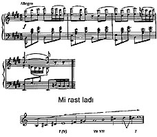 Belə ki, birinci musiqi cümləsində tonika (mi) ilə üst tersiya (sol-diyez) arasında dalğavari hərəkət tonikada tamamlanır. Melodiyanın ikinci cümlədə VII pilləyə – lya səsinə istinad etməsi musiqi materialına bir qədər inkişaf gətirir, melodiyanın diapazonunu genişləndirir və enən hərəkətlə tonikaya qayıdılır. Klassik funksional sistem baxımından melodiya mi majorda harmonizasiya edilmişdir. Harmoniyada tonika və subdominanta funksiyaları əsas yer tutur. Bu plaqallıq melodiyanın quruluşu ilə bağlıdır. Belə ki, mi rast ladının tonikası və üst kvartası mi majorun tonikası və subdominantası ilə üst-üstə düşür. Bu uyğunluqdan bəstəkar harmonizasiyada istifadə edir.