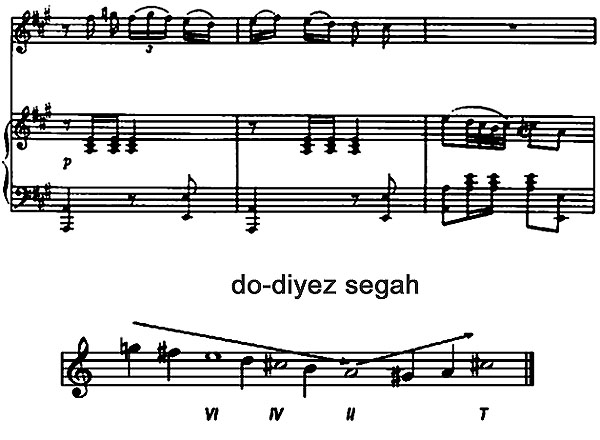 Göründüyü kimi, melodiya lya majorda harmonizə olunmuşdur. Bu tonallıq segah ladının istinad pillələri ilə bağlı olaraq istifadə olunur. Melodiyada predyomlu hərəkət diqqəti cəlb edir. VI pillədən (mi) aşağıya doğru enən hərəkət segah ladında qurulmuş melodiyalar üçün səciyyəvidir. Instrumental müşayiətdə qammavari gedişlərdə səslərin xromatizmi özünü göstərir: məsələn fa diyez – fa bekar xromatizmi (VIIb) segah ladı üçün xarakterikdir.