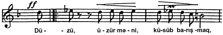Bu misralar mahnıda onlara müvafiq olan melodik cümlə ilə təkrarlanır. Həm kuplet, həm də nəqərat bölmələrinin sonunda səslənən bu cümlə üç qısa ibarəni özündə cəmləşdirir. Onlardan birinci «deyir, deyir» sözləri ilə birgə təkrarlanmaqla, sonuncu misranın səsləndiyi üçüncü ibarəni hazırlayır. Misralaın öz aralarında ümumi qafiyə ilə bağlı olmaması melodiyada qətiyyən duyulmur. Kuplet və nəqəratın 7 hecalı misralar səslənən digər cümlələri öz həcminə görə daha genişdir. Beləliklə də bəstəkar mətndə əsas olan və bəndlərin sonunda təkrarlanan misraları musiqidə daha qabarıq şəkildə tərənnüm etməyə nail olmuş və bunu uzun və qısa, qafiyələnən və qafiyələnməyən misraların və melodik cümlələrin növbələşməsi yolu ilə etmişdir.