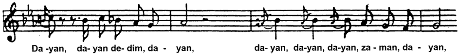 Göründüyü kimi, melodiyada hər «dayan» sözü xüsusi olaraq vurğulanır, və, bunun nəticəsində, misralarda heca sayı bölünməyə məruz qalır. Nəqəratın sonuncu cümləsi (ona nəqəratdakı şer bəndinin üçüncü misrası uyğun gəlir) əvvəlki cümlələrlə müqayisədə yekun rolu oynayır və mahnı bununla bitir.