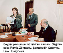 Zeynalabdin Babayev (tarzən, Naxçıvan Dövlət Filarmoniyasının bədii rəhbəri): Səyyar plenumun müzakirəsində söylənilən bütün iradları və tənqidləri çox təbii qəbul edirik. Belə ki, gələcəkdə bundan bir nəticə çıxarmalıyıq. Ümumiyyətlə, qeyd etməliyəm ki, Naxçıvan Dövlət Filarmoniyasının 3 kollektivi var: Xalq Çalğı Alətləri Orkestri, Kamera Orkestri, Mahnı və rəqs ansamblı. Mən bu kollektivlər üçün əsərlər yazmaq haqqında Naxçıvan bəstəkarlarına müraciət etmişəm. Naxçıvan Dövlət Filarmoniyası bu əsərləri təbliğ etməyə hazırdır. Mən Filarmoniyanın bədii rəhbəri kimi əmin edirəm ki, qeyri-peşəkar əsərlər Filarmoniyanın konsert proqramlarına yol tapmayacaq. Mən bunun qəti əleyhinəyəm. Yalnız yüksək professional səviyyəli əsərlər çalınacaq. Biz qısa müddətdə bu problemləri həll etməyə çalışacağıq.