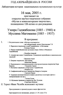 N.A.Rimski-Korsakov adına Sankt-Peterburq Dövlət Konservatoriyasının nəzdində «SSRI xalqlarının musiqisi kabineti» bu dövlətin tərkibinə daxil olan xalqların incəsənətinin tədrisində və təbliğində səmərəli fəalliyət göstərir. Düzdür, SSRI-nin süqutu ilə əlaqədar olaraq həmin kabinetin bağlanmaq qorxusu var idi. Ancaq kabinetin rəhbəri dosent T.V. Broslavskayanın səyləri nəticəsində o bağlanmadı vəhazır da«Milli musiqi mədəniyyətlərinin tarixi laboratoriyası»kimi işini davam etdirir. Qafqaz xalqlarının musiqi mədəniyyətinin yüksək qiymətləndirən T.V.Broslavskayanın (o, gürcü musiqisi üzrə mütəxəssisdir) təşəbbüsü və rəhbərliyi ilə bu il may ayının 19-da konservatoriyada Azərbaycan bəstəkarları Ü.Hacıbəyovun və M.Maqomayevin anadan olmasının 120 illiyinə həsr olunmuş «Muğam və bəstəkar yaradıcılığı» mövzusunda tələbə elmi konfransı keçirilmişdir. Yığıncağı giriş sözü ilə laboratoriyanın rəhbəri, Bros lavskaya açmışdır. Sonra məruzələr dinlənilmişdir. Məruzə mövzularının düşünülmüş, planlı şəkildə seçilməsi və beləliklə də Azərbaycan bəstəkarları yaradıcılığının ən müxtəlif cəhətlərdən işıqlandırılması diqqətəlayıq idi. Onlardan bəzilərini xatırladaq: «Ü.Hacıbəyov və M.Maqomayevin yaradıcılıq taleyində paralellər» (O.Kovmir), «Ilk Azərbaycan operası «Leyli və Məcnun» (A.Podobed), Ü.Hacıbəyovun «Koroğlu» operasında muğam ənənələri» (A.Toreva), «Müxtəlif mədəniyyətlərdə meliz-matik oxuma ənənələri» (E.Titova) və s.