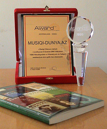 Беля ки, «AWARD» дцнйа саммити тяряфиндян кечирилян «Азярбайжан Е – Контент 2005 мцкафаты» Милли мцсабигясиндя «Мядяниййят» номинасийасы цзря «Мусиги Дцнйасы» галиб елан едилмишдир. «Мусиги Дцнйасы» тяряфиндян йарадылмыш сайтлардан бири – Цзейир Щажыбяйовун «Азярбайжан халг мусигисинин ясаслары» електрон дярслийи Русийада кечирилян «Гызыл сайт» мцсабигясиндя Азярбайжаны тямсил едян йеэаня сайт олмушдур.