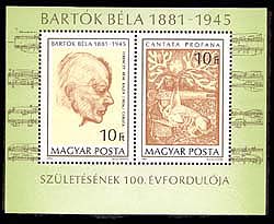 Bela Bartok – dahi bəstəkar, pianoçu və Macarıstan, Rumıniya, Slovakiya, Serbiya, Bolqarıstan, Ukrayna, Xorvatiya, Türkiya və ərəb ölkələri folklorunun ən tanınmış araşdırıcısıdır (3 marka və bir blok). Onun musiqi yaradıcılığı folklorun ən əski və dərin qatlarından qidalanan qeyri-adi melodika və ritmlə seçilir. Bela Bartokun bir sıra əsərləri, o cümlədə «9 sehrli maral» kantatasının klavirı (blok) və «Göysaqqallı hersoq» operası macar markalarında öz əksini tapmışlar. «Ağacdan düzəldilmiş şahzadə» baletindən səhnə isə Monqolustan miniatüründə öz əksini tapıb.