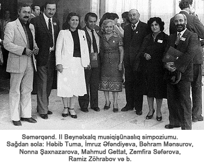 1983-жц илин октйабр айынын 7-дян 12-я гядяр гядим Сямяргянд шящяриндя икинжи бейнялхалг мусигишцнаслыг симпозиуму кечириляжякди. Бу симпозиума бир чох юлкялярдян йцксяк сявиййяли ифачылар вя мусигишцнаслар эяляжякди. Бу симпозиум цчцн мян дя «Мир Мющсцн Нявваб» вя «Цзейир Щажыбяйов» китабларыны (рус дилиндя) йазмышдым, щям дя Ц.Щажыбяйлинин илк дяфя няшр етдийимиз «Лейли вя Мяжнун» операсынын партитурасыны ора апармаьы планлашдырмышдыг. Симпозиумда мян «Мир Мющсцн Нявваб вя онун «Вцзущцл-яргам» рисаляси» мювзусунда мярузя иля чыхыш етмяк истяйирдим. Бящрам мцяллим дя мяним мярузями тарда мцшайият етмяйя юз разылыьыны вермишди. Мян Няввабын жядвялини эюзял каьызда бизим мемарлара чякдирмишдим. Бящрам мцяллим бу жядвял цзря унудулмуш муьамлары бярпа едиб чалмалы, онларын адларыны чякмяли иди. Симпозиумда беля дя олду. Трибунадан асылмыш жядвял цзря Бящрам мцяллим тарда чалараг кечидлярдя муьамларын адларыны чякирди. Бизим чыхышымыз бюйцк уьур газанды.