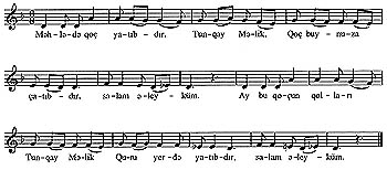 «Bizim Ilisu dağlar qoynunda yerləşən gözəl bir kənddir. Hava həmişə dumanlı, çəmrəli (çənli) olur, tez-tez yağış yağır. Bizim dağlara qoyun gedir. Şimşək çaxanda vəziyyət çox çətin olur. Onda bizim arvadlar ağacdan qayrılmış çömçə götürüb, başına yaylıx bağlayır, aşağısına don geydirirlər. Yeddi nəfər qız çömçə xatunu götürüb bu mahnını oxuya-oxuya qapı-qapı gəzirlər.