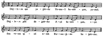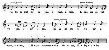 Ilisuda aldığımız mə’lumat, burada yaxın keçmişlərədək hər iki mərhələnin mahnılarla birlikdə icra edildiyindən xəbər verir. Əldə etdiyimiz «Bənövşə» mahnısının ifası ilə əlaqədar onu qeyd etmək olar ki, həmin çiçəyi təmsil edən qız söz mətninə uyğun olaraq müəyyən hərəkətlər edir, bənövşənin açılıb-yumulmasını qolları ilə təsvir edir. Maraqlıdır ki, eyni mahnının başqa bir melodik variantı yeni sözlərlə oxunduqda öz janr məzmununu dəyişə bilir. (4)