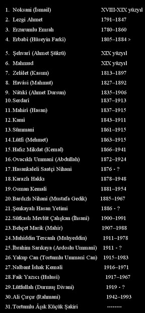 Бу арашдырма просесиндя ялдя едилян мялуматлара эюря Ярзурумлу ашыглардан дюврцмцзя йалныз шеирляри эялиб атмыш олан ясас 31 ашыьын йарадыжылыглары тядгиг едилмишдир. Бу ашыгларын бязиляри щаггында йетяринжя мялуматлар олмамасына бахмайараг онларын адлары вя йашадыглары дювря баьлы ашаьыдакы мялуматлар ялдя едилмишдир: