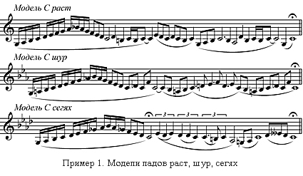 Ученики должны осознавать, что каденция несет информацию в контексте. С этой целью автором были построены модели семи основных азербайджанских ладов – раст, шур, сегях, шуштер, чаргях, баяты-шираз, хумаюн7. Модель включает в себя звукоряд лада и характерные для него ритмические и ладоинтонационные особенности, в том числе и комплекс различных, возможных для данного лада каденций. Модели ладов содержат необходимую и достаточную информацию для идентификации лада, они эмоционально окрашены, лаконичны и легко запоминаются на слух. Модели создают ладовую настройку и тем самым способствуют развитию когнитивно организованного ладоинтонационного слуха. Ниже представлены модели ладов раст, шур , сегях (пример 1).