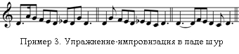 Упражнение-импровизация в ладе шур (пример 3). У. Гаджибеков пишет: «Четвертая ступень звукоряда (ре – И. А.) несет функцию тоники лада. От данной ступени допускаются скачки только в восходящем направлении: на верхнюю медианту, кварту и квинту» 10.