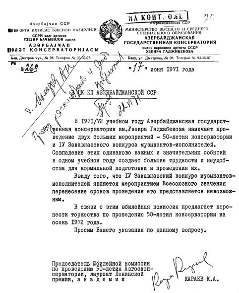 Гара Гарайев Азярбайжан КП МК-йа 17 ийун, 1971-жи ил тарихли, 269 №-ли мяктубунда йазыр ки, 1971-жи илдя республикада ики важиб мусиги тядбири кечириляжяк. [4] Онлардан бири консерваторийанын йубилейи, диэяри мусиги ифачыларынын ЫВ Загафгазийа мцсабигясидир. Гара Гарайев щяр ики тядбирин цмумиттифаг ящямиййятини вя важиблийини, икисинин дя бирбаша Консерваторийа иля баьлы олдуьуну йазараг, тяклиф едир ки, йубилей тядбиринин вахты дяйишдирилсин вя 1972-жи илин октйабр айына кечирилсин.