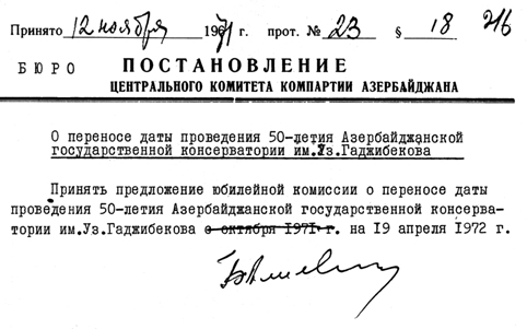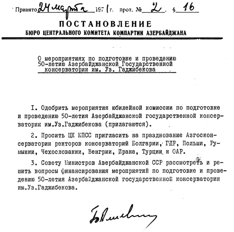 Азярбайжан КП МК-нын биринжи катиби Щейдяр Ялийев тяряфиндян имзаланмыш йубилей тядбирляри щаггында гярары илк дяфя мусиги ижтимаиййятиня тягдим едирик: