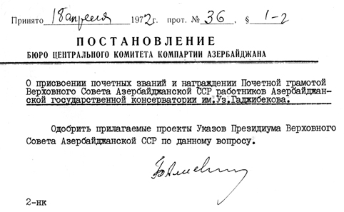 Азярбайжан ССР Али Совети Ряйасят Щейятинин йубилей тялтифляриня даир тягдим етдийи лайищя Азярбайжан КП МК Бцросунун 18 апрел 1971-жи ил тарихли гярары иля тясдиг олунур. [7].