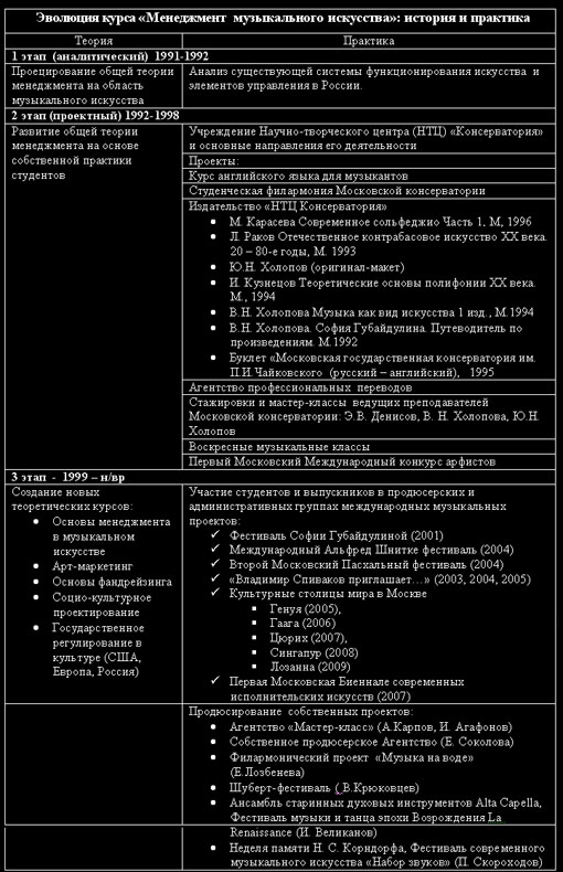 Именно подобная, образно говоря, «композиция учебного предмета» лежит в основе курса «Менеджмент музыкального искусства», введенного в 1991 году Кафедрой междисциплинарных специализаций музыковедов в учебную программу Московской государственной консерватории им. П.И.Чайковского 1 .