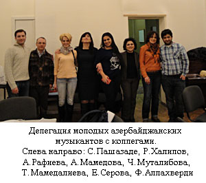 В прошлом году исполнилось 20 лет с момента установления дипломатических отношений между Украиной и Азербайджаном. Музыкально-творческие связи же двух стран восходят к более давнему времени. Возрождение и углубление развития этих отношений и стало главной целью межкультурной программы, продуманной и разработанной Союзами Композиторов и МинистерствамиКультуры обеих стран. Первым шагом в данном направлении стали Дни украинской музыки, приуроченные к 20-летию установления украино-азербайджанских дипломатических отношений и проведенные по инициативе и руководством председателя Союза композиторов Азербайджана, народной артистки Азербайджана Франгиз Ализаде в марте прошлого года в Баку. Ответный шаг был предпринят годом позже: под активным руководством начальника департамента искусств, композитор М.Б.Шведа, а также председателя правления Национального Союза Композиторов Украины И.В.Щербакова была организована встреча с азербайджанскими коллегами.