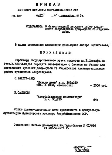 Тядгигатларымыз заманы Дювлят Ядябиййат вя Инcясянят Архивиндян ялдя етдийимиз сянядляр дя бу фикиримизи тясдиг едирляр. Мясялян, Мядяниййят Назиринин ев-музейин тяшкили иля баьлы ашаьыдакы сянядляри мусигишцнаслыг иcтимаиййятиня тягдим едирик [7] :
