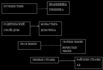 Ю. М. Лотман в статье "О понимании географического пространства в русских средневековых текстах"2 дает интересную диаграмму. Это модель вертикальной оси движения героя из отчего дома на сторону далече и в конечном итоге в ад, либо, наоборот, через покаяние в рай.