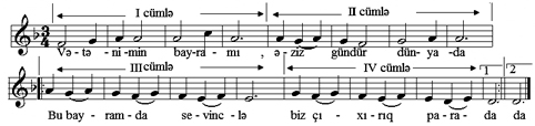 Мелодийадан эюрцндцйц кими онун бянд щиссяси щяряси 4 ханядян ибарят 2 мелодик жцмлядян, нягаряти дя ейниля 2 мелодик жцмлялярдян йаранмышдыр.
