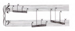 9. Bu işarəyə “hazırlanmış” (preparasiya olunmuş) piano” istifadə olunan əsərlərdə rast gəlinir. Göstərilən interval arasındakı notlar əvvəldən hazırlanmalıdır. Adətən bəstəkar bu notların hansı materiallarla preparasiya olunacağını səhifənin başında yazır (məsələn: plastik, şüşə, metal, kauçuk və s.). Bu materiallarla simlərin səsi qısılır.