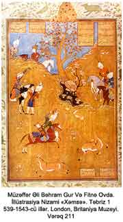 onun əlləri cilovda olardı. Ümumiyyətlə, at gedə-gedə musiqi alətində ifa etmək mümkün deyil. Fitnə hətta hər iki işi eyni zamanda görmək iqtidarında olsaydı belə, onlar bir-birlərinə mane olardı və Bəhram şah musiqidən həzz ala bilməzdi. Eyni zamanda bir adamın köməyi olmadan əlində cəng ata minmək və ondan düşmək çox çətin və ağlabatmayan işdir.