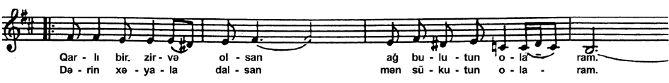 Mahnının kulminasiya anına təsadüf edən nəqəratda kupletdəki cümlə kvinta yuxarıda səslənir, bu da onu digərlərindən fərqləndirən amillərdən biridir. Cavab cümlədə isə yenidən mahnının əvvəlində səslənmiş cümlə variant dəyişiklikləri ilə səslənir. Beləliklə də, «Güllər» mahnısında olduğu kimi, burada da melodik cümlələr AABA prinsipi üzrə qurulur.