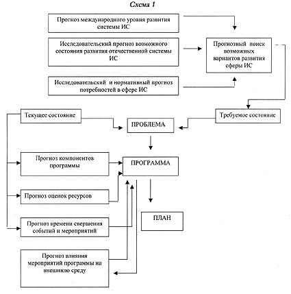 Nicesleduöhaə sxema (sm. sxema 1)illöstriruet svəzğ proqnozov-proqramm i planov s poziüiy sistemnoy metodoloqii dlə sistemı (sferı) I S.Privodimaə sxema əsno svidetelğstvuet, çto osuhestvlenie proqnoza löboqo proüessa, sobıtiə v t.ç. strateqii pri uslovii ukazaniə putey dosticeniə neizbecno trebuet perevoda proqnoza v ploskostğ nekotoroy proqrammı, detalizovannostğ kotoroy opredeləetsə isxodnımi potrebnostəmi.