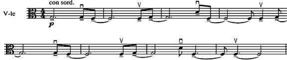 Ы щисся билаваситя симфонийанын ясас мювзусунун ифадяси иля башлайыр. Лакин о, там шяклиндя верилмир. Эюзцмцз юнцндя, тядрижян, санки, портрет йараныр: яввялжя бир штрих, сонра икинжи, цчцнжц, дюрдцнжц. Будур, бир-бирини тамамлайан айры-айры штрихлярдян образ ямяля эялир. Мелодийа виолаларын cон сордино ифасында арамла сяслянмяйя башлайыр. Йырьаланан секунда интонасийалары цзяриндя гурулан мювзу лайлай кими сяслянир. Мелодийа санки инсан няфясини, щярарятини, ритмик шякил ися бешийин йырьаланмасыны жанландырыр. (Нцмуня 1.)