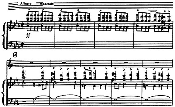 ЫЫЫ щисся ися Аллеэро модерато темпиндя башланыр. Бу щисся оркестрин унисонунда фф-да ж молл тоналлыьында, 4/4 юлчц алле браве-дя башланыр. Даща сонра скрипкалар вя няфясли алятлярин зил реэистриндя аксентли сяслянмяляри верилир.