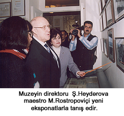 Бу мцнасибятля Л. вя М. Ростроповичлярин ев-музейиндя дя Д.Шостаковичин 100 иллик йубилейиня щяср олунмуш сярэи тяшкил едилмишди. М.Ростроповичля бирликдя ев-музейиня чох щюрмятли гонаглар: гызы Йелена Ростропович, Президент апараты Мядяниййят ишляри цзря шюбя мцдири Ф. Абдуллазадя, Мядяниййят вя Туризм Назиринин Ы мцавини С. Мяммядялийева, Америка-да Вишневскайа вя Ростропович фондунун президенти Билли Амас, фондун Азярбайжан нцмайяндялийинин президенти С.Мяммядов, Ростроповичин библиографы ханым Мириам, бястякарларымыздан Е.Нязирова, Ф.Ялизадя вя башгалары эялдиляр. Эялян гонаглар нцмайиш олунан уникал експонатлардан тяшкил олунан сярэи иля таныш олдулар. Тяшкил едилмиш сярэидя М. Ростроповичин Д. Шостаковичля баьлы музейя щядиййя етдийи надир материаллар, програмлар, дискляр вя с. нцмайиш олунурду. Фото сярэидя музейин фондунда олан мараглы материаллардан вя шяхси архивлярдян ялдя олунмуш фотошякиллярдян истифадя едилмишди. Бурада Д.Шостаковичин ушаглыг, эянжлик, йеткинлик дюврлярини якс етдирян фотошякилляр, бир чох танынмыш мусигичилярля: Б.Бриттен, С.Рихтер, Д.Ойстрах, Й.Мравински, С.Озава вя башгалары иля олан фотошякиллярини эюрмяк олар. Хцсуси олараг Д.Шостаковичин М.Ростропович вя Г.Вишневскайа иля достлуг вя йарадыжылыг ялагялярини якс етдирян материаллары, бястякарын М.Ростроповичя щяср етдийи ЫЫ виолончел консертинин титул вярягиндя олан автографыны гейд етмяк истярдик. Щяля 1959-жу илдя мцяллиф консерт цзяриндя ишини тамамлайыб М.Ростроповичя тягдим етдикдя сорушур: « Слава, дейин эюрцм, доьруданмы бу мусиги сизин хошунуза эялир? » Тярифли жаваб ешидян Д.Шостакович севиняряк «Шцкцр Аллаща. Демяли мян сизя щяср едяряк йазмаьы бажарырам » дейя гейд едир. Мящз Шостаковичин виолончел консертляри иля М.Ростроповичин дириъорлуг ампуласында чох сцрятли щярякяти башланыр. Д.Шостаковичин она щяср етдийи ЫЫ виолончел консерти цзяриндя ишляйяркян виолончелист дейир: «Мян даима дириъорлара щясяд апармышам. Мян даима 100 симли виолончел арзуламышам. Шостаковичин истедады алятин гейри-мцкяммяллийини цстяляйир. Бу мусигини ифа едяркян, мян юзцмц дириъор сявиййясиндя щисс едирям».