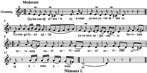 Нцмуня цчцн сечдийимиз мащны мусиги фолклорумузун инжиляриндян олан “Губанын аь алмасы” мащнысыдыр.Яввял онун мелодийасына бир нязяр салаг: (Нцмуня 1.)
