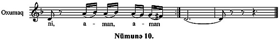 Бу мащныда айрыжа бир ханя дя вар ки, мащнынын щеч бир йериня бянзямир – хцсуси бир емосийа йцкц дашыйыр. Зяннимизжя, бу, ”Губанын аь алмасы” мащнысынын емоссионал зирвясидир: (Нцмуня 10.)