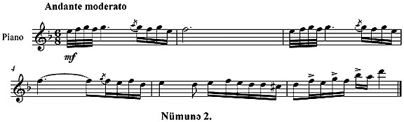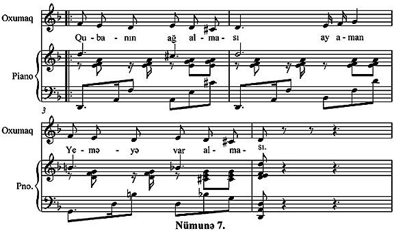 Кечяк мащнынын вокал щиссясинин ишлянмясиня. Ясярдя ритмик-щармоник ишлянмя иля бярабяр бир контрапунктуал мелодик “хяттин” олмасы вокал партийасына ялавя бир бязяк ола биляр: (Нцмуня 7.)