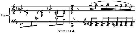 Субдоминантаны тяйин едян “сол-си бемол-ре”аккорду иля “сол-си бекар-ре” аккордунун йердяйишмяляри дя щармоник дили рянэляндиряр: (Нцмуня 4.)