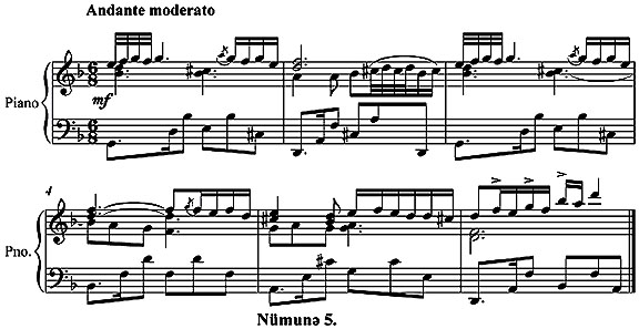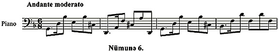 Эюрцндцйц кими, бу нцмунядя мусиги алятляринин, демяк олар, щяр нювц (бямдян зиля) цчцн мусиги материалы нязярдя тутулуб – ейни заманда бям нотлар, щятта,ясярин ритмик гурулушуну, нятижя олараг,ритмик юлчцсцнц дя (6\8) тяйин етмиш олур: (Нцмуня 6.)