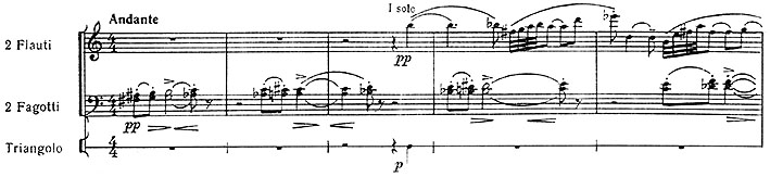 Мювзунун икинжи кечиди флейталарын терсийалы ифасында, остинатолу щармоник формуланын фонунда сяслянир. Эюрцндцйц кими, фагот флейтайа нисбятян эярэин, кяскин тембря малик олан алятдир. Вя бурада тембр фяргляри щисс олунур.