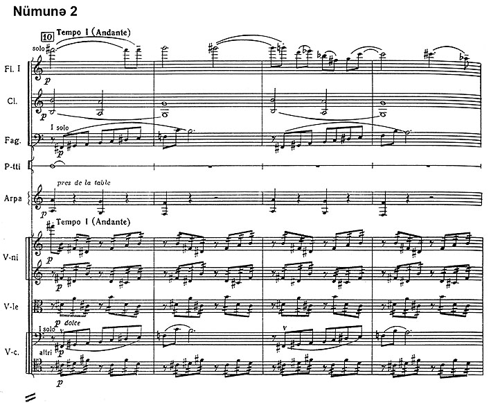 Бурада алятшцнаслыг тябии мянтиги иля, мцдрик садялийи вя инжя сечилмиш цсуллары иля валещ едир. Мясялян: 2-жи рягямдян Ы скрипкаларын йухары реэистрдя дашыдыьы мелодийа 2 флейта вя 2 кларнетин щармоник фигурасийалы фонунда арфа вя литаврларынын тремолаларынын узанан сяслянмяси, юз колоритиня эюря чох ифадялидир.