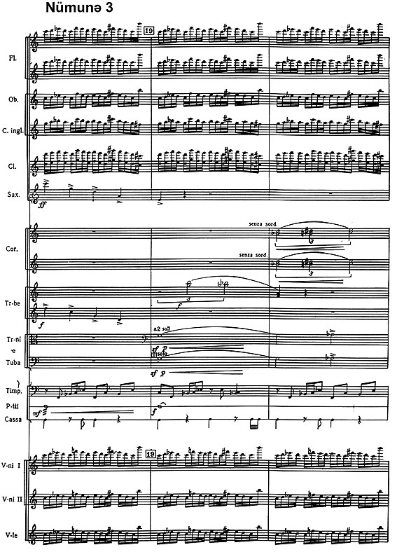 Йайлыларын мювзусу тамамиля йени емосионал тябягя ямяля эятирир. Бу тябягянин юзцнямяхсуслуьу оркестря хцсуси тембря малик олан алт саксофонун эятирилмясидир. Сакит, мелоидк бир валс сяслянир. Диапазон тядрижян эенишлянир. Тембрал рянэарянэлилик хроматик щярякят едян терсийаларын щесабына инкишаф едир. Беля ки, бурада Ы вя ЫЫ скрипкалар щярякяти ашаьы истигамятя апараркян, алтлар вя виолончелляр щярякяти она якс олараг ашаьыдан йухарыйа доьру апарыр. Саксофон артыг юз мювзусуну (13-жц рягямдя) Ы вя ЫЫ скрипкалара ютцрцр. 14 вя 15-жи рягямлярдя сяслянян мусиги материалы ясярин мяркязи кулминасийасыны щазырлайыр. (16-жы рягямдя) Аллеэро виво темпиндя, бястякар, литавра вя бюйцк барабанын йени остинатолу ритмик фигуруну, (21-жи сайа кими), йяни бюйцк бир бюлмя бойунжа сахлайыр. Эащ йайлылар групунун, эащ да тахта няфяс алятляринин ифасында сяслянян мелодик фигурасийа (17-жи рягямдян 20-жи рягямя кими), фигурасийалы контрапункт ролуну ойнайыр.Фигурасийалы контрапункт – нисбятян аз фярди олан фигурасийалара ясасланан фон сясидир. Онун цчцн ритмик бярабярлик даща характерикдир. Мусиги тядрижян эярэинляшяряк драматик, експрессив характер алыр. Беля характер йайлыларын моторлу ифасы, трубанын кяскин фрулатолу интонасийасы вя вертикал цзря эярэин ритмик комплексляр щесабына ялдя едилир. Беля бир эярэин сяслянмянин цзяриня эенишлянмиш мювзуну дашыйан цч тромбон, труба вя дюрд валторналар гойулараг оркестр сяслянмяси цч ффф-йя гядяр йцксялдилир. Ващимяли бир сяслянмя йарадылыр. (Нцмуня 3.)