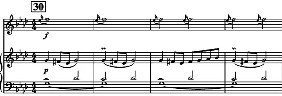 Сонра солистин мювзусу оркестря щяваля едилир. Орта щисся чох йыьжамдыр, бурада да секвенсийалы щярякят ясасдыр. Ясас мювзунун репризасы А1 - бир гядяр дяйишикликлярля верилир, бурада оркестрдя полифоник елементляр (йени контрапункт сяси) ялавя олунур. Баьлайыжы мювзу ясас мювзунун мотив ишлянмясиня ясасланыр.