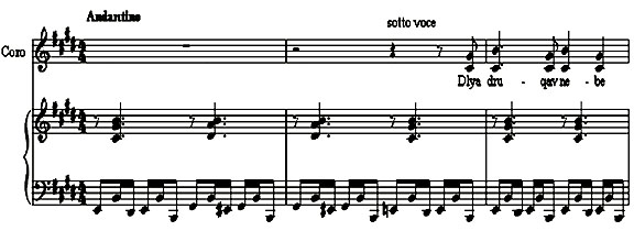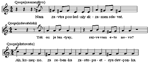 Дуетдя сяслянян вокал партийалар бир гядяр речитативя йахындыр. Ясасян Гоганын партийаларында мятн габардылыр. О, Волканы тянгид едир, она истещза едир вя буна эюря дя онун нитг тярзи юн плана кечир. (Нцмуня 1.)
