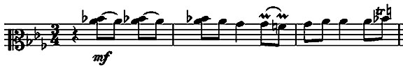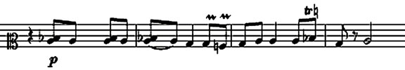 Эюстярилян икинжи нцмуня щямин ясярин мелодик тематик хцсусиййяти кими бир октава ашаьы щяжминдя сяслянир. Бу нцмуня бир даща ясас мювзунун истянилян гядяр щярякяти цчцн эениш имкан олдуьуну, билаваситя тарын фактура хцсусиййятиня уйьунлуьуну нцмайиш етдирир.